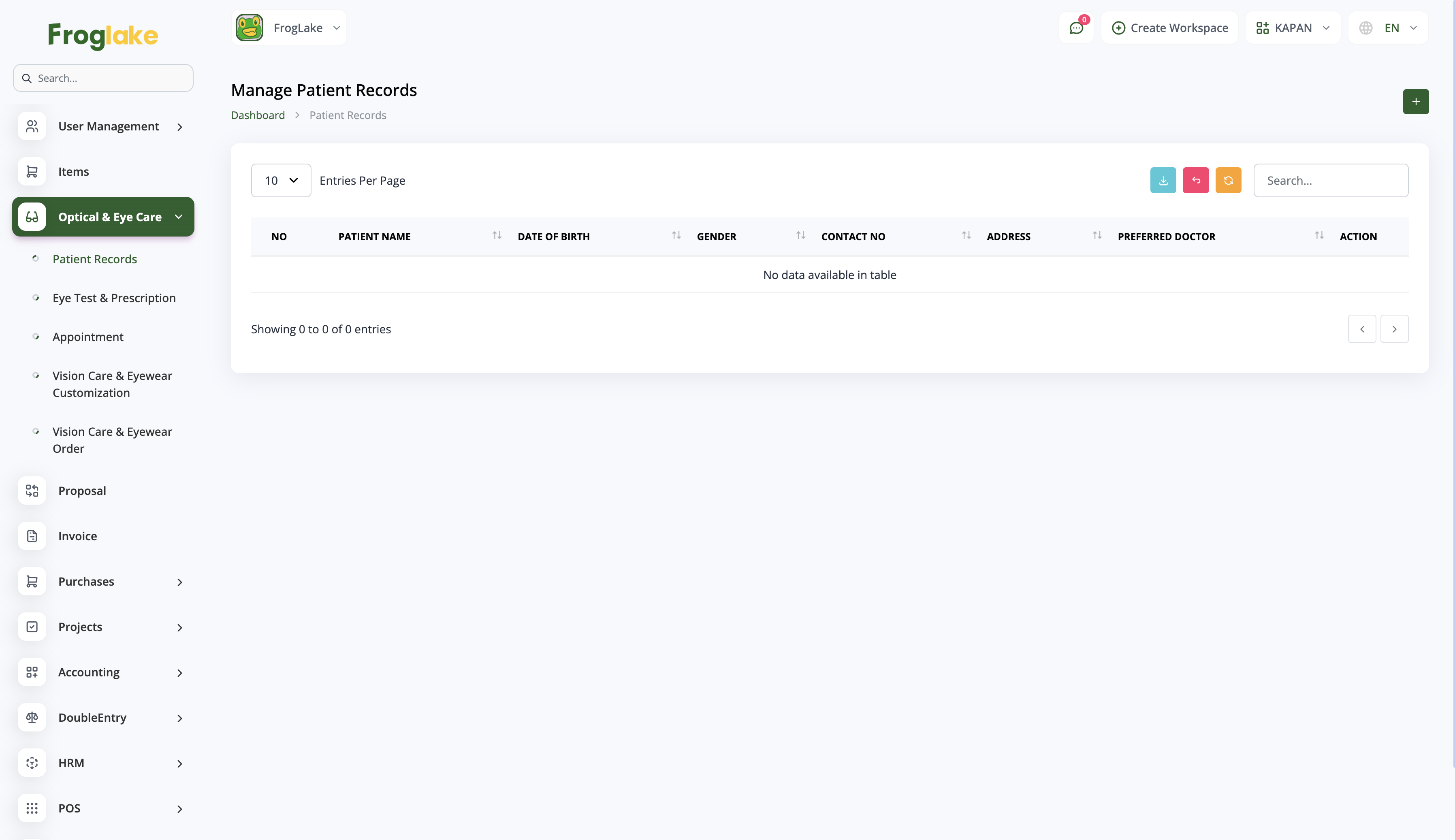 The Optical Care and Eye Care Center module in FrogLake Dash is a comprehensive solution built for optometrists, ophthalmologists, and optical store owners. It simplifies the management of patient records, eye tests, prescriptions, and appointments, while also supporting vision care services and eyewear customization. With digital tools for record-keeping and patient engagement, FrogLake Dash helps eye care providers work more efficiently, deliver better service, and create an improved experience for every patient.