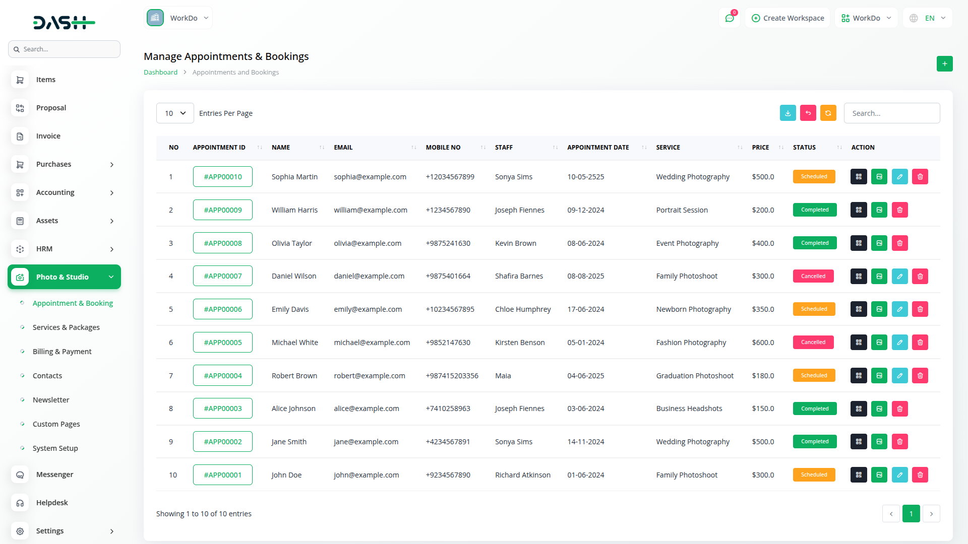 Dash SaaS provides a straightforward solution for billing and payment management in your photo studio. Once a booking or service is completed, you can easily add payments, track transactions, and generate receipts for your clients.